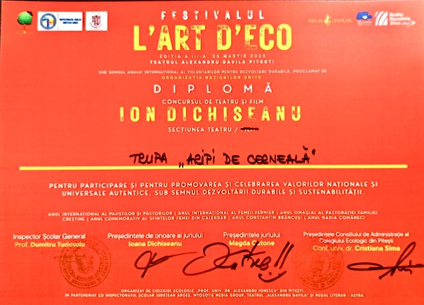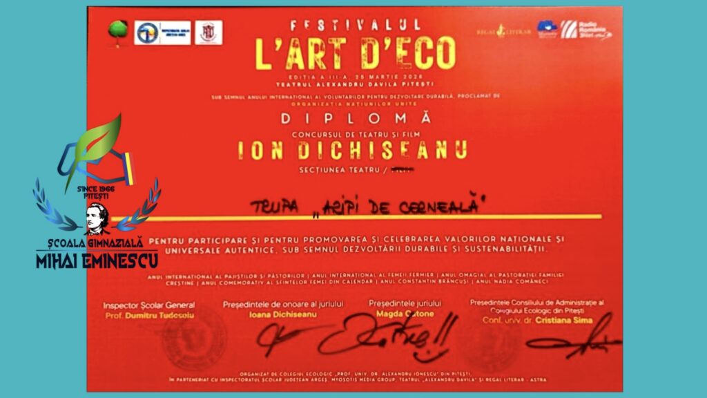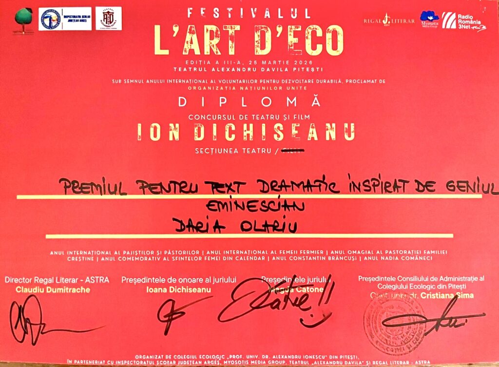 O echipă de elevi talentați ai Școlii Gimnaziale „Mihai Eminescu” Pitești au participat la Concursul de Teatru și Film „Ion Dichiseanu”, desfășurat pe data de 25.03.2026 la Teatrul Alexandru Davila din Pitești, obținând premii frumoase, care le-au răsplătit pasiunea pentru artă, sensibilitatea, curajul și capacitatea de a-și contura o relație cu lumea definită de valori spirituale. Festivalul „L’art D’eco”, ajuns la a treia ediție, a inclus, așadar, concursul de Teatru și Film „Ion Dichiseanu”, care s-a bucurat de prezența unor echipe de actori coordonați de profesori cu experiență în arta dramatică și de un juriu prezidat onorific de artista Ioana Dichiseanu, fiica regretatului actor Ion Dichiseanu, cât și de actrița Magda Catone. Concursul a inclus scenete teatrale și scurtmetraje realizate de elevi din unități de învățământ preuniversitar, școli și cluburi de profil, cu vârsta de până la 19 ani.