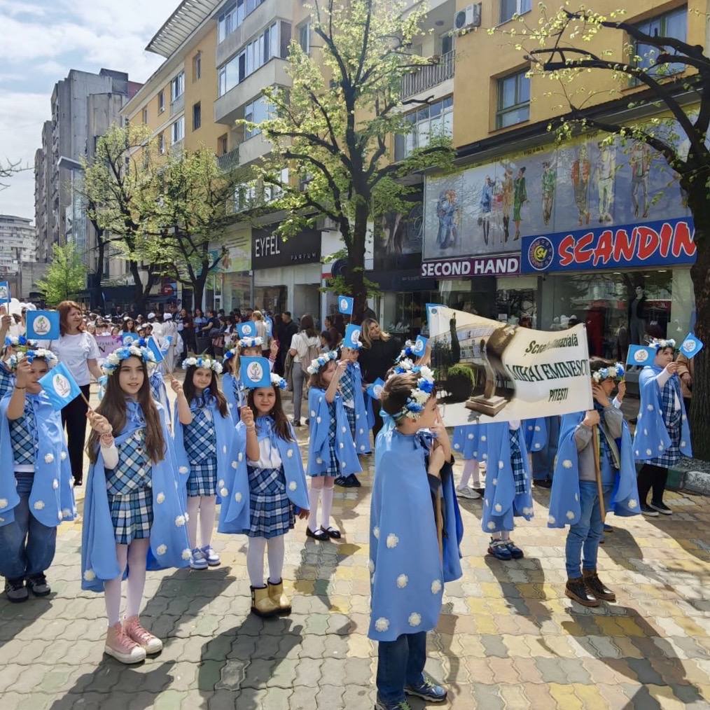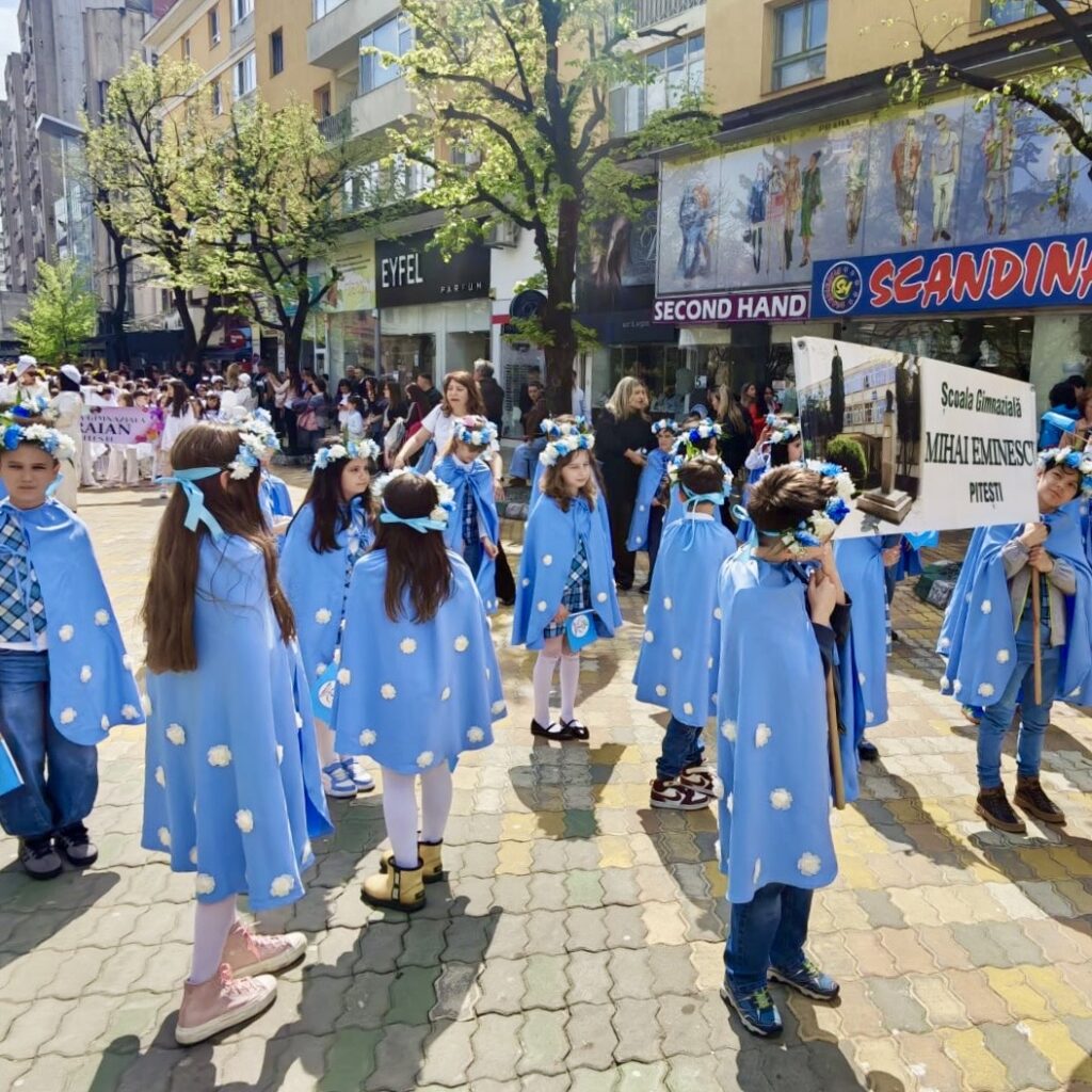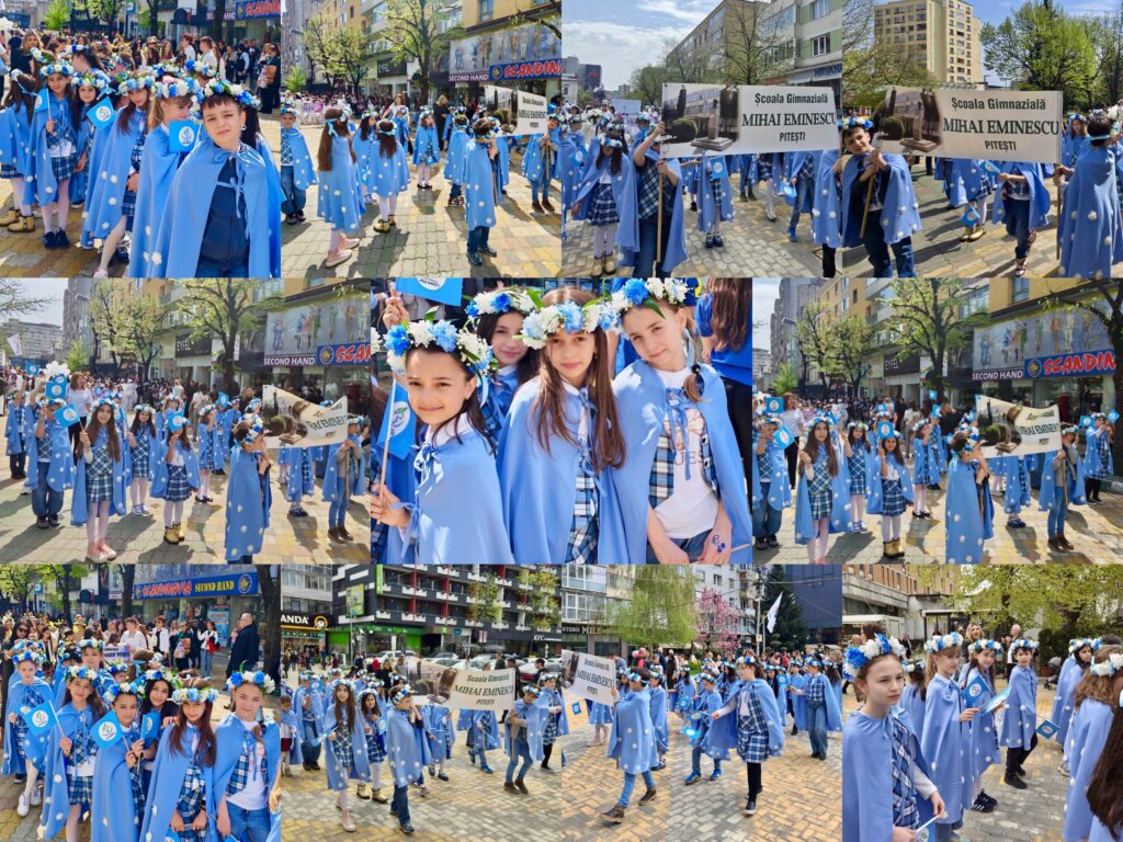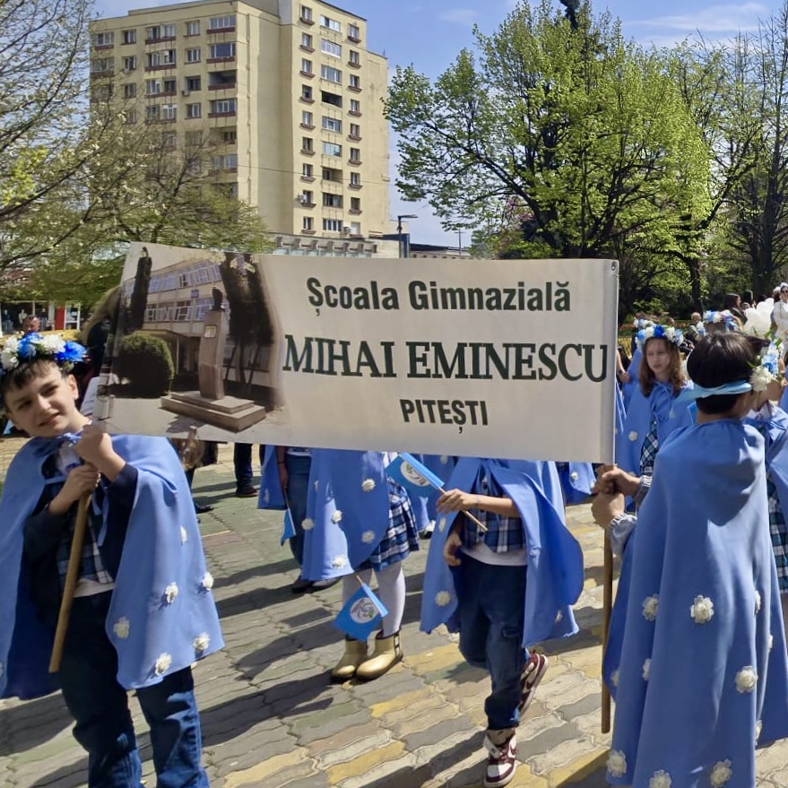 💐Școala Gimnazială „Mihai Eminescu” Pitești a participat la Parada Florilor, în centrul Municipiului Pitești, o manifestare în cadrul Simfoniei Lalelelor, evenimentul simbol care transformă an de an comunitatea într-o veritabilă grădină urbană. Îmbrăcați în uniformă și purtând în mâini stegulețe cu simbolurile instituției de învățământ, micii „eminescieni” au parcurs traseul paradei cu zâmbete largi, captivând privirile spectatorilor. Entuziasmul copiilor a demonstrat, încă o dată, că spiritul Școlii „Mihai Eminescu” este unul viu, orientat către frumos și implicare socială. A fost o zi memorabilă în care gingășia lalelelor s-a împletit armonios cu inocența copilăriei, lăsând în urmă amintiri prețioase pentru elevi, părinți și profesori deopotrivă.